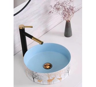 Lavabo đặt bàn hình tròn màu trắng họa tiết hươu, cây