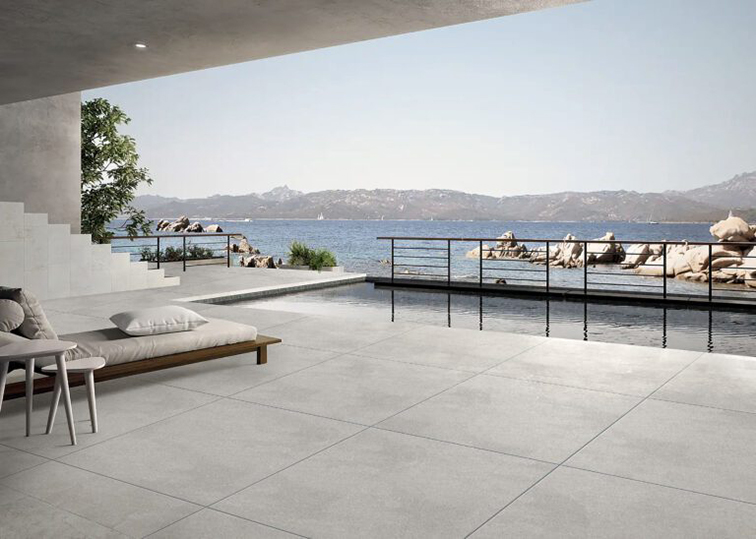 - Đá Porcelain cao cấp, màu xám trắng, vân xi măng hiện đại