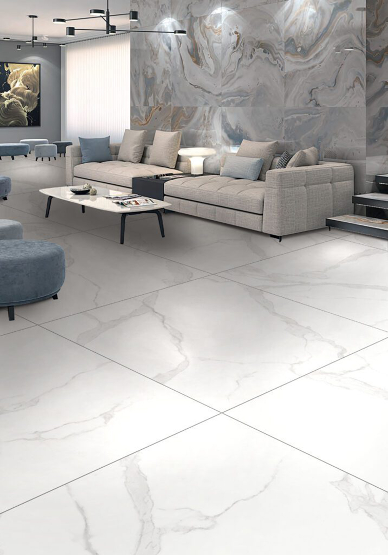 • Xương đá Porcelain cao cấp, màu trắng vân khói đơn giản, hiện đại
