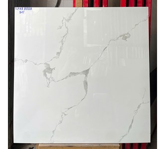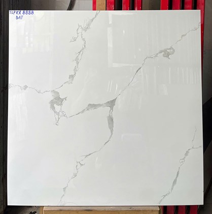 - Đá Porcelain, phủ men bóng, màu trắng, vân xám nhạt pha ghi đá sang trọng, hiện đại