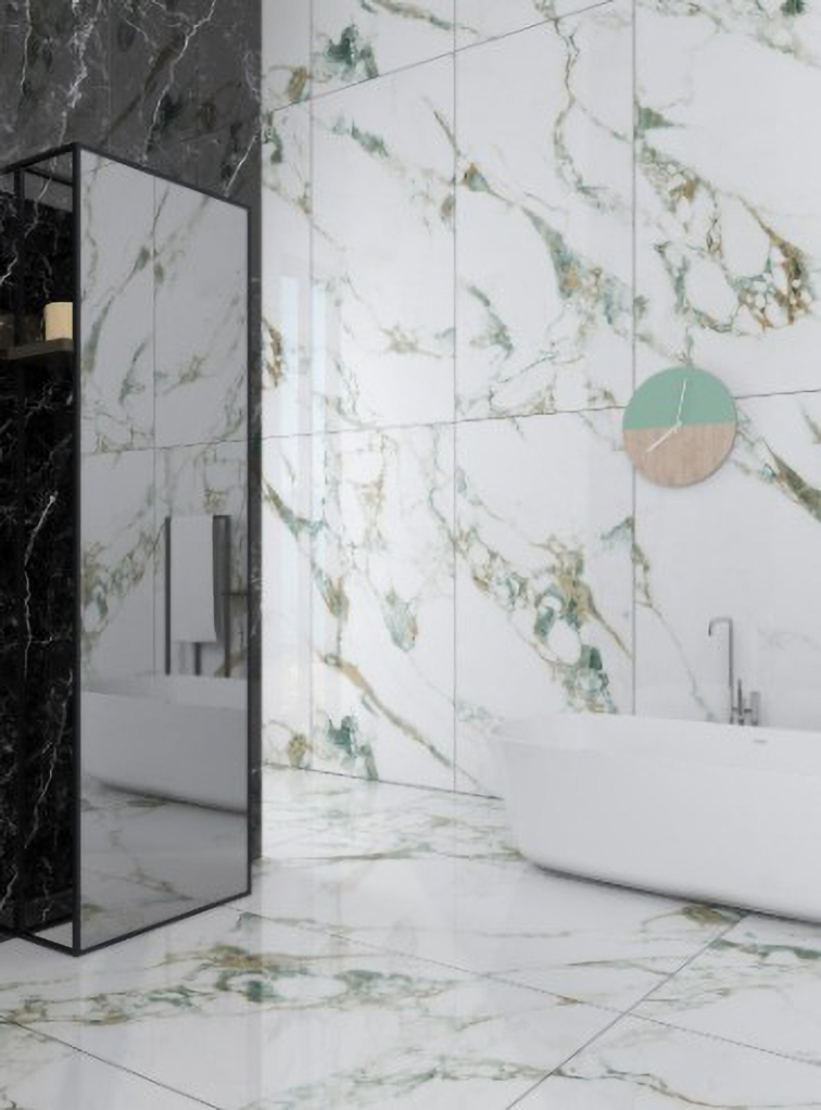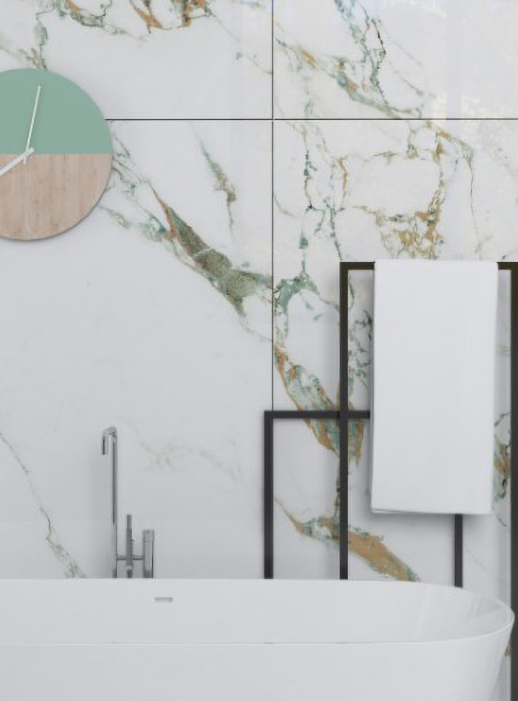 - Đá Porcelain cao cấp, màu trắng vân đá xanh rêu, nâu hiện đại