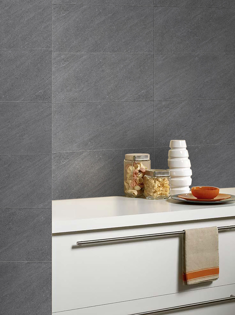 - Đá Porcelain cao cấp, màu xám đậm, vân bê tông hiện đại