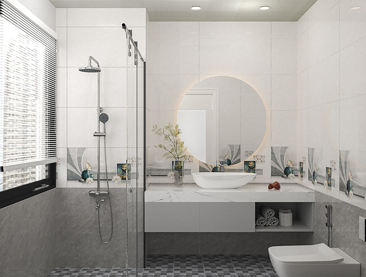 - Màu xám vân đá, điểm họa tiết bình bông trắng độc đáo, sang trọng