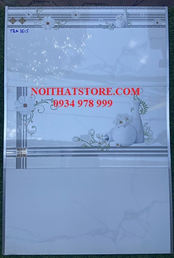 - Gạch men bóng, màu trắng vân xám, điểm bình bông trắng