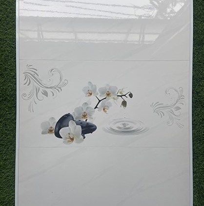 • Gạch men bóng, màu trắng vân xám, điểm nhánh lan trắng