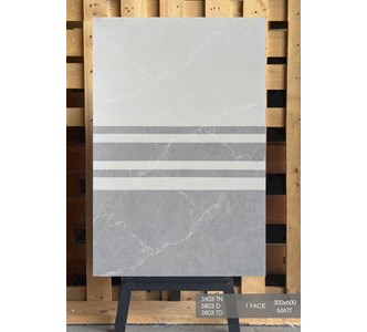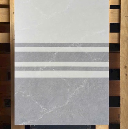Gạch Ceramic, bề mặt phủ men mờ, màu xám nhạt vân đá, điểm họa tiết sọc ngang hiện đại, sang trọng