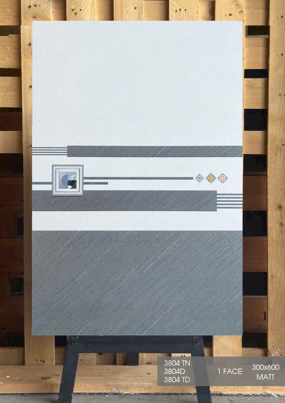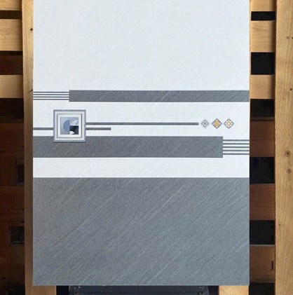 Gạch Ceramic, bề mặt phủ men mờ, màu xám vân đá chéo, điểm họa tiết sọc ngang, hoa văn đối xứng hiện đại, sang trọng