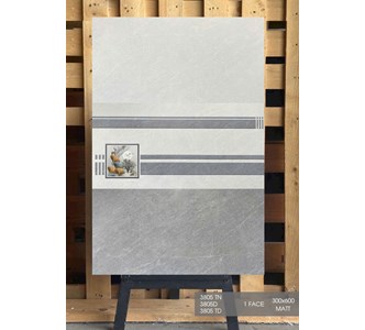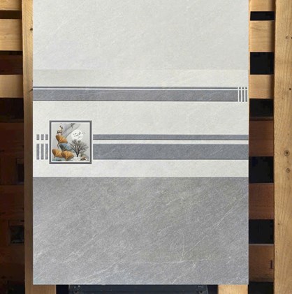 Gạch Ceramic, bề mặt phủ men mờ, màu xám vân đá, điểm họa tiết sọc ngang, hươu vàng hiện đại, sang trọng