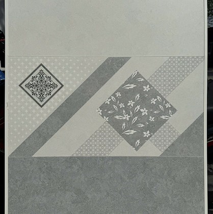 - Gạch men mờ, màu xám ghi vân đá, điểm họa tiết hình học, hoa văn tinh tế, hiện đại