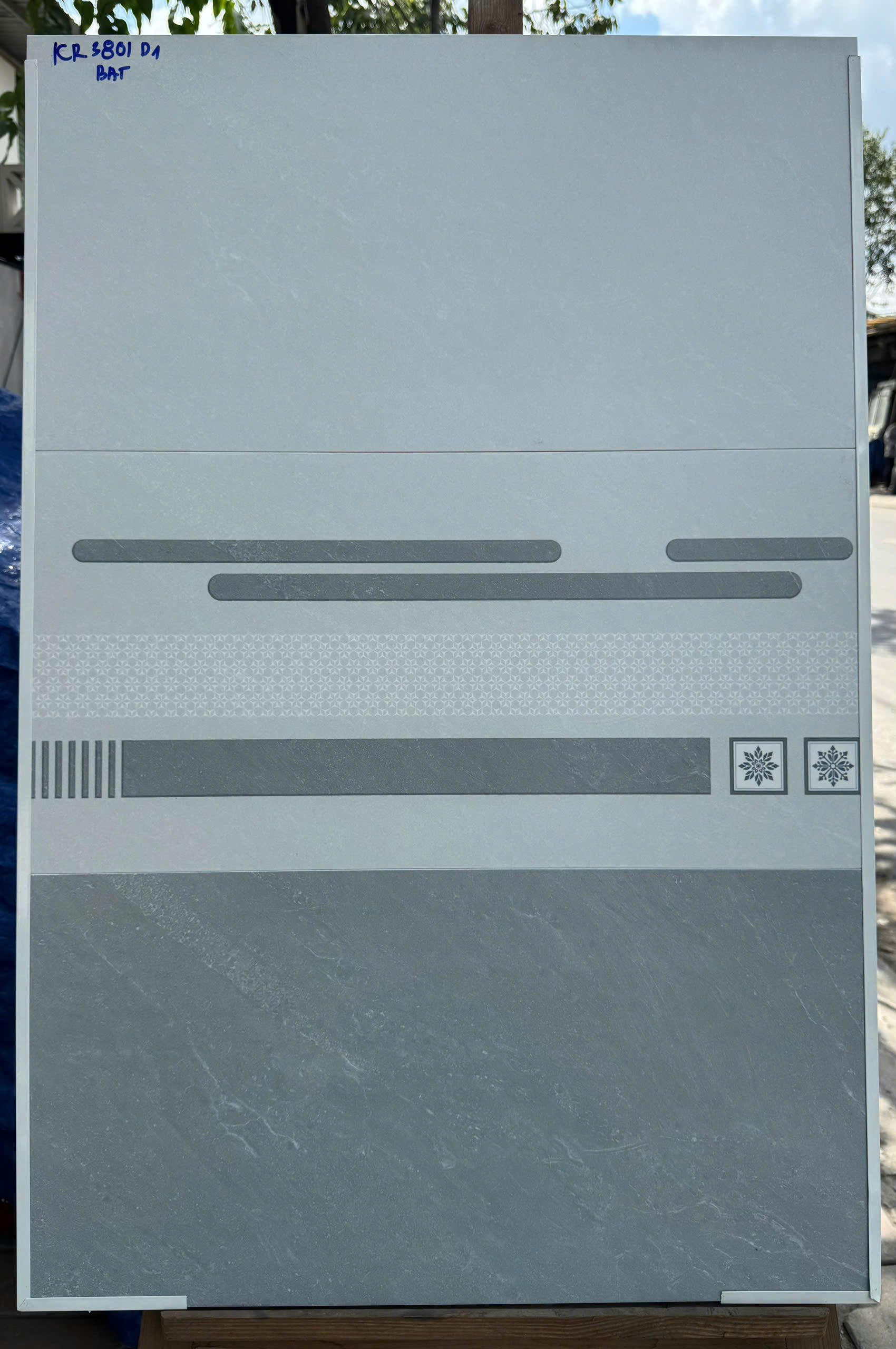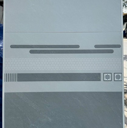 Gạch Ceramic, bề mặt phủ men mờ, màu xám nhạt vân đá, điểm họa tiết sọc ngang hiện đại, sang trọng