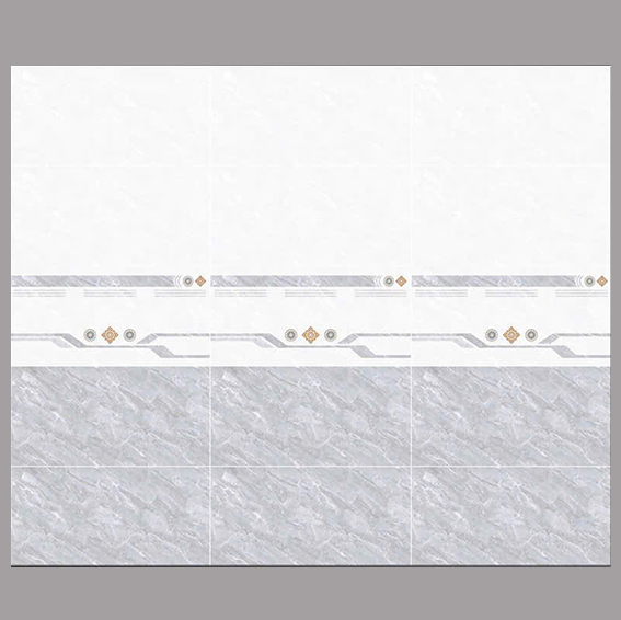 - Gạch men mờ, màu xám ghi vân đá, điểm họa tiết sọc ngang, hoa văn vàng đồng hiện đại