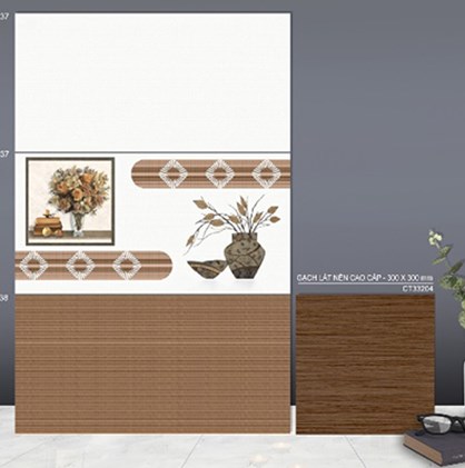 • Gạch men bóng, màu nâu kem vân sọc, điểm bình bông