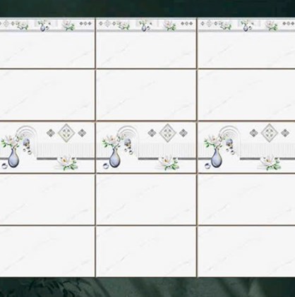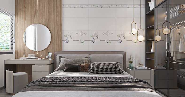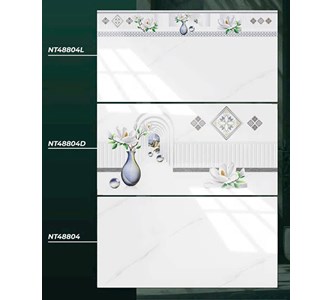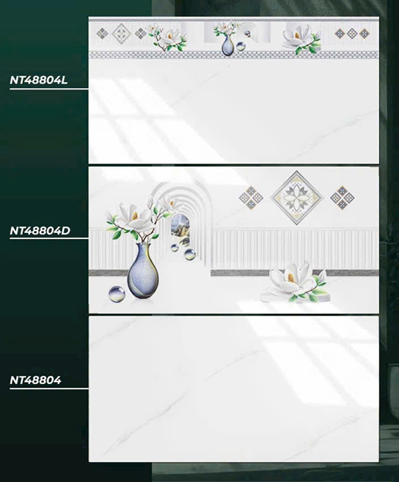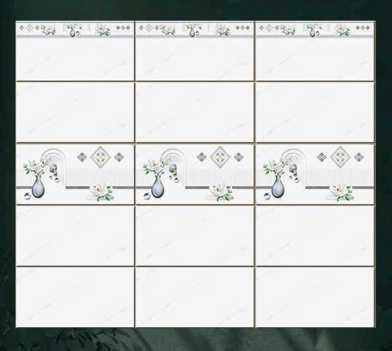 - Gạch men bóng, màu trắng vân khói, điểm họa tiết bình bông độc đáo