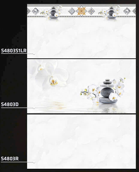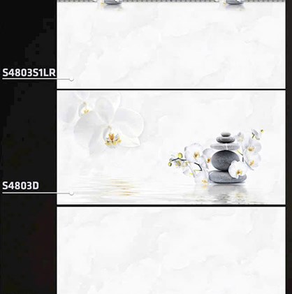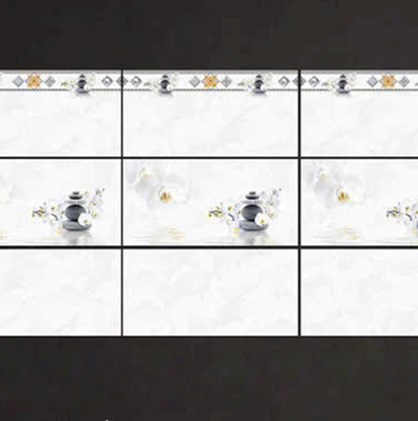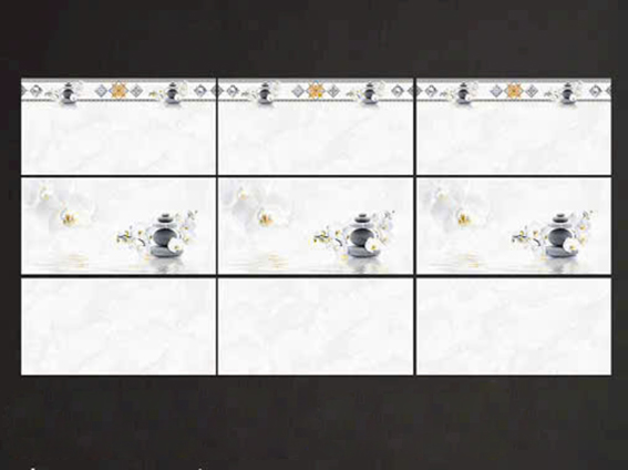 - Gạch men bóng, màu trắng vân đá, điểm họa tiết hoa lan, sóng nước độc đáo
