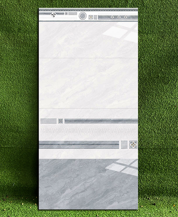 - Gạch men bóng, màu xám ghi vân đá, điểm họa tiết hình học độc đáo