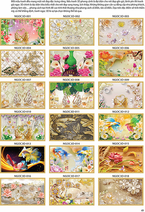 ► Mỗi mẫu tranh đều mang một nét đẹp đặc trưng riêng. Nếu tranh 3D phong cảnh là đại diện cho sự gần gũi, bình yên, thư thái, thì tranh giả ngọc 3D là đại diện nổi bật nhất cho nét đẹp sang trọng, lịch thiệp, tính thẩm mỹ cao. Với những khu vực, không gian cần sự đẳng cấp như phòng khách, phòng làm việc,... có phong cách tạo hình đề cao tính thời thượng thì tranh ngọc 3D sẽ là sự lựa chọn không thể bỏ qua.